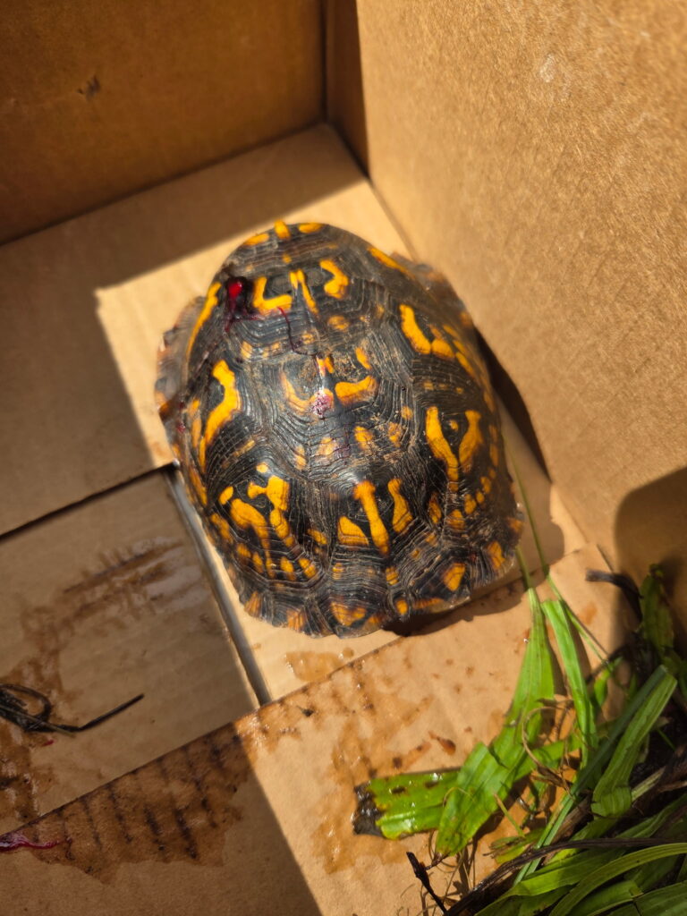 This box turtle was hit by a car and had a cracked shell as a result. Remember, if you see a turtle in the road, please try to avoid it! If you want to help it, make sure you safely pull off of the road and move the turtle in the direction it is traveling so it will keep going and stay out of harms way.